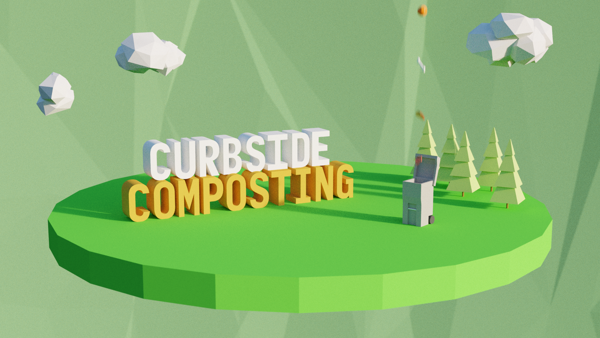 This was a fun little project I did for the City of Eugene and their new “Curbside Composting” program. I’d wanted to do a ‘lowpoly’ project for a while, and when the city seemed open to doing a 3D animated spot, I pitched it hard! I had this idea of a small map of the city with a huge hardbody particle system dumping food over the city to represent how much food waste gets thrown away. Then I would present the idea of throwing your food waste away using fun, pastel graphics and use little cylinders as the ‘stages’ by which everything would transition. I had two weeks to produce this video, and the result was a fun test of my skills as an artist and creative.