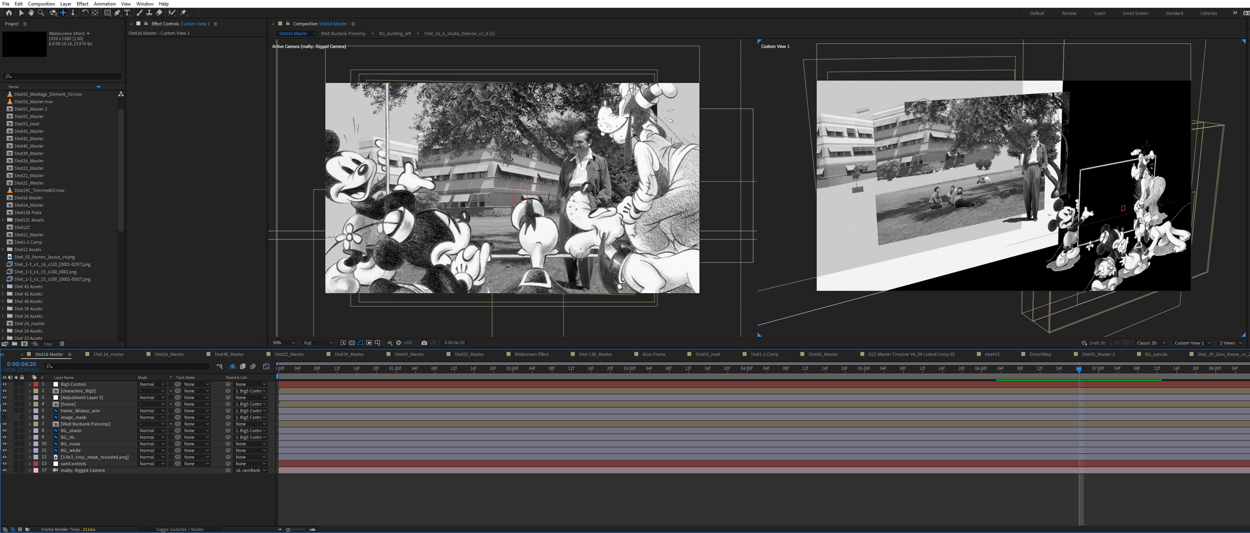 Compositions within compositions was the norm, using different separated layers to bring the virtual camera through time and maintain the effect. Constant camera motion and high resolution assets was key to pulling off the intended effect.