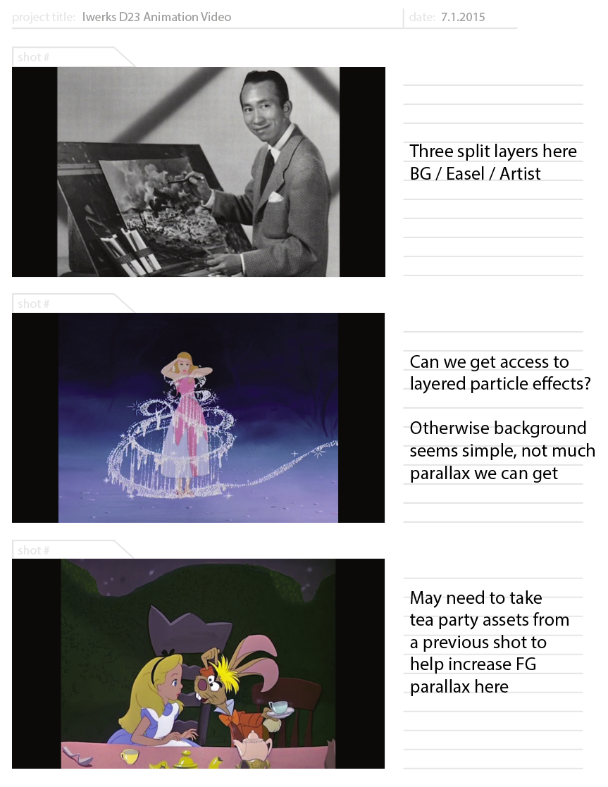 One of my favorite shots I directed was the opening shot. We started on an old-timey frame and zoom in on the familiar picture of Walt Disney’s garage studio where Disney first started. But then it becomes obvious that we are headed into the picture! We faithfully recreated the entire garage scene in 3D, and then used the first animation - “Alice in Wonderland” - as the ‘interior’ of the garage to help get our video started.