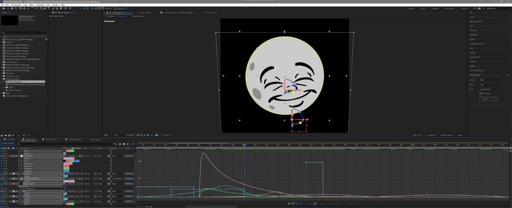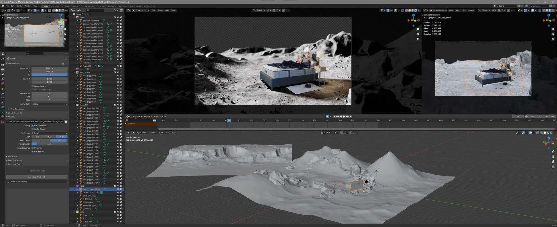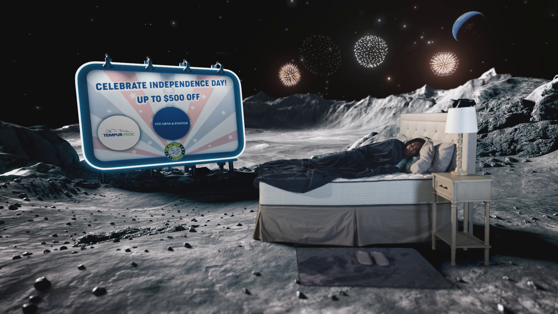 The ending logo was a combination of a CG moon rendered in Blender and a 2D vectorized version of the Mattress Company logo.