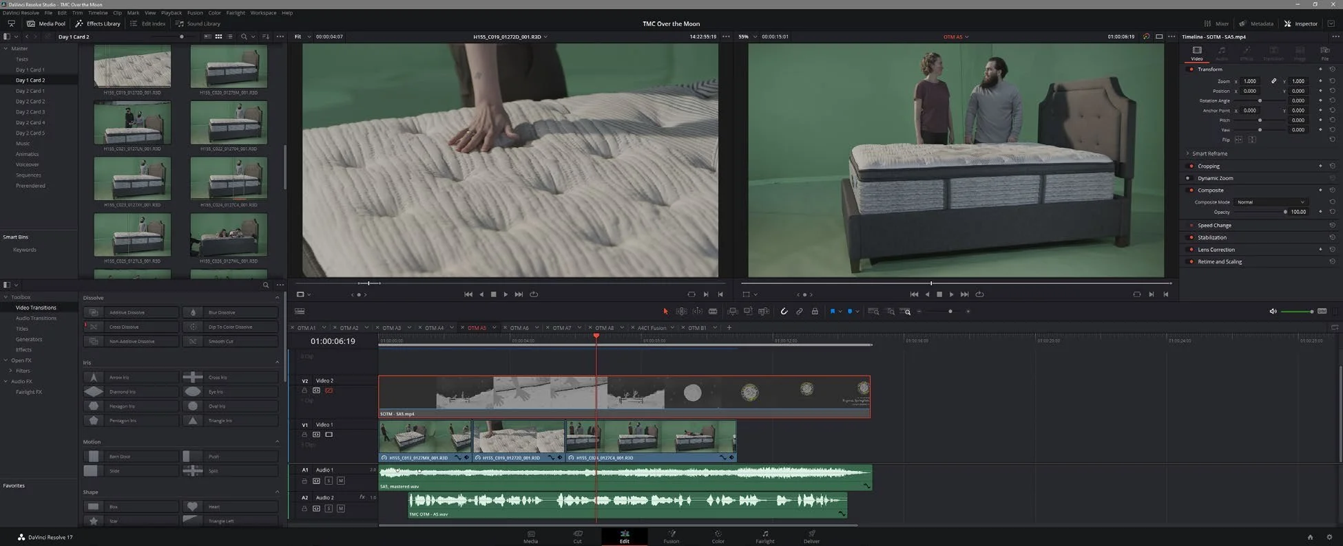 After creating the storyboards for the entire sequence, it was time to film them. Over the course of three days in a small warehouse studio, we built the greenscreen, loaded it up with several beds, and filmed the cast, capturing both their “A” story spots and the “B” version that was just a simple plate for the billboard edits.