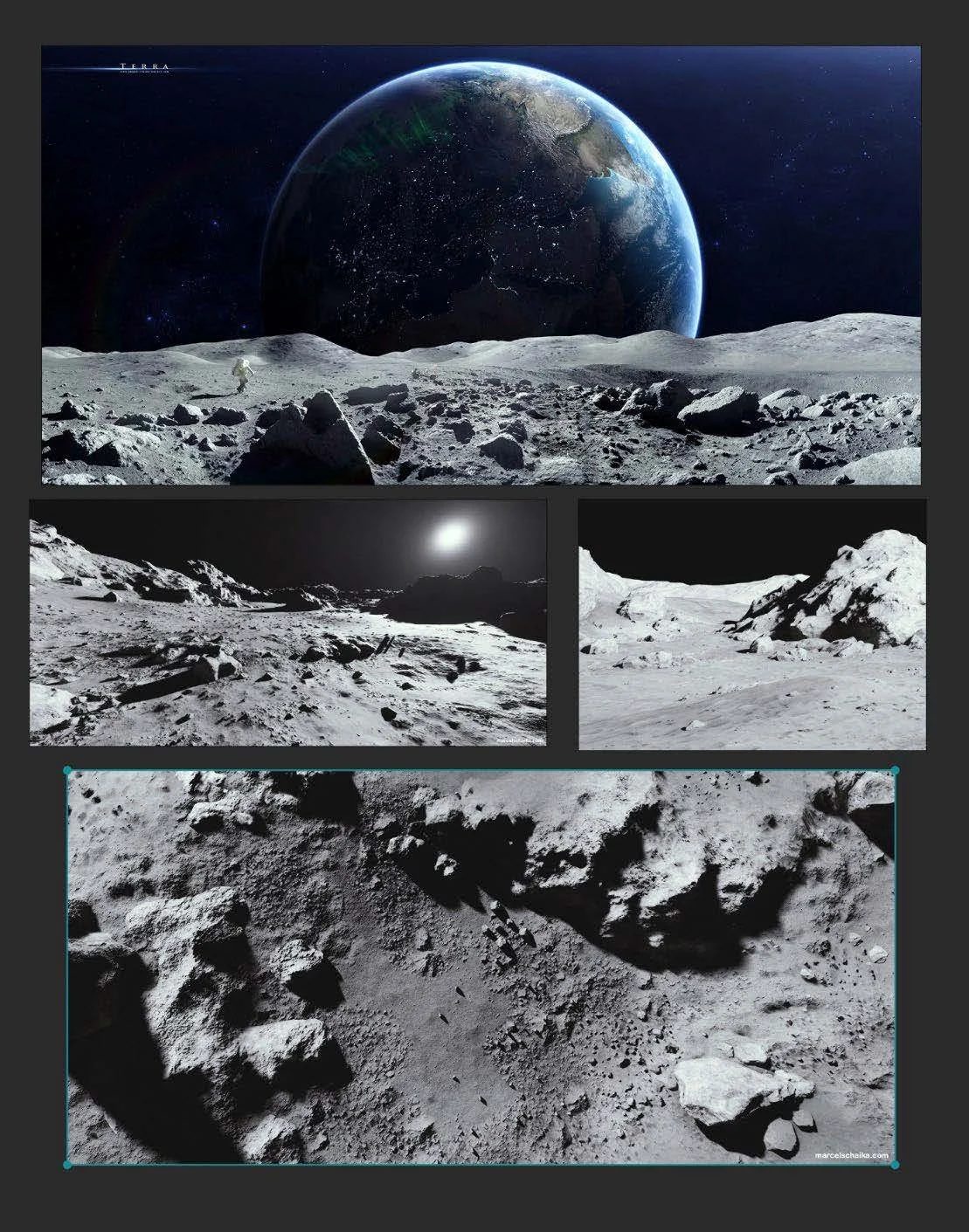 I wanted the moon’s surface to be as realistic as possible to contrast with the cozy bedtime scenes we’d be incorporating. This was the reference sheet I used for lighting.