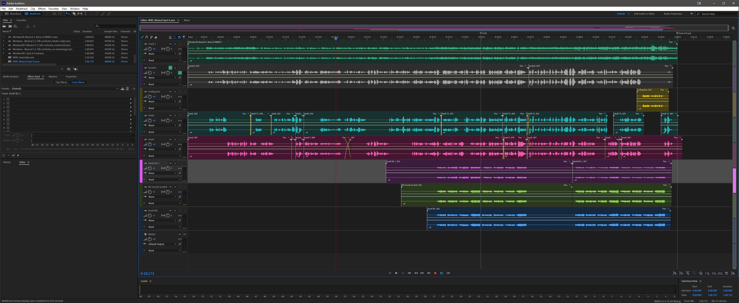 The initial recording layout of the different vocal tracks recorded on location. We had four different harmonies for both the male and female singers.